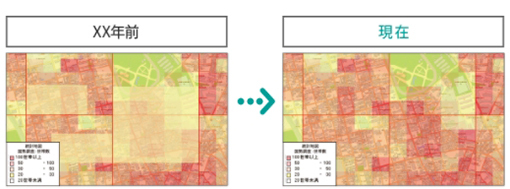 ZENRIN Maps APIには、過去から現在までの建物属性情報・施設情報・各種統計データなどを地図基盤に搭載している。様々なコンテンツ表示や検索機能、過去情報などを活用し、地域の変遷を捉えることで、対象エリアの状況把握に活用できる。
