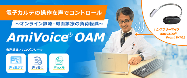 AmiVoice OAMは、オンライン診療・対面診療での診察記録・電子カルテなどの入力業務や、マウスコントロールなどを、音声認識を活用して効率的に行うことができるクラウドサービス。音声認識に特化したバッジ型ウェアラブルマイク端末「AmiVoice Front WT01」と専用ネックバンドアダプターを装着することで、声マウス、音声入力、ボイス付箋など、ハンズフリーでパソコンのコントロールや文章作成が行える。