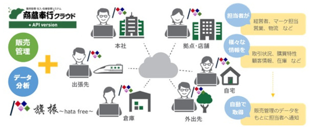 今回の旗振~hata free~との連携では、商蔵奉行クラウドを便利に利用するため、データ分析・通知サービスの機能を実装している。経営・販促に役立つ情報を自動で各担当者に通知することができるため、今まで気付けなかった情報を顕在化させ、新規ビジネスの創出、既存顧客の深堀に役立てることが可能。通知方法はメールだけでなく、チャットツールなど利用中のコミュニケーションツールで連携する。