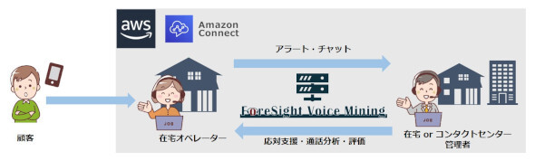 具体的には、在宅のオペレーターは管理者の支援が必要になった場合、ForeSight Voice Miningを利用することで遠隔にいる管理者へアラート機能やチャット機能によって助けを求めることができる。アラートを受けた管理者は、高度な音声認識AIでリアルタイムにテキスト化されたオペレーターの通話内容と音声通話を確認でき、遠隔からのフォローが可能。在宅でも適切なタイミングで支援できる。
