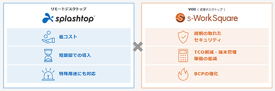 splashtop × s-WorkSquareハイブリッドパックは、自宅や外出先から会社パソコンにリモート接続して画面操作を行えるリモートデスクトップサービス「splashtop」と、接続先端末をクラウド上で一元管理する仮想デスクトップサービス「s-WorkSquare」を組み合わせて、リモートアクセス環境の導入をまるごとサポートするテレワークサービス。即日運用が開始できる。