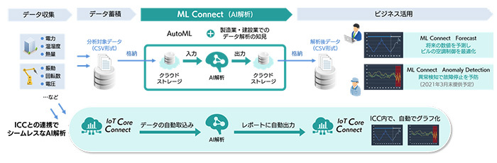 また、MLCはSBTのIoTプラットフォーム「IoT Core Connect(ICC)」との連携が可能。ICCと連携した場合、IoTデータの収集・管理・可視化から、MLCへのデータ連携やMLCによるデータ解析の結果の可視化までシームレスなサービスを提供する。