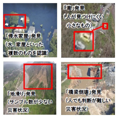 学習サンプル数が少なくてAIに教えることが通常は困難な災害状況に対しても、精度良く認識することが可能。さらに、見逃し・誤分類などの誤った情報を多く含む学習サンプルに対応したAI学習手法によって、人でも判断が難しい災害状況の誤認識や見逃しを減らすことができる。