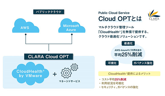 これによって、クララオンラインはマネージドサービスを拡充するとともに、パブリッククラウド契約ユーザーに対してCloudHealthを利用できるアカウントとマネージドサービスをセットにしたクラウド最適化ソリューション「Cloud OPT」を提供する。