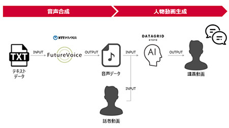 AIを活用したMOOC講座は、講師が話している数分程度の動画と、テキストデータから生成した音声データをもとにAIで講師動画を生成することで、講座をまるで講師本人が話しているように再現する。音声合成技術をもつNTTテクノクロスと、AIによる人物動画生成技術をもつデータグリッドの最先端技術を活用して講義動画を生成し、gaccoを運営するガッコがNTTドコモと連携して講座の提供を行う。