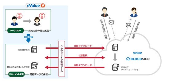 eValue V ドキュメント管理連携テンプレート with クラウドサインは、「eValue V ドキュメント管理」とクラウドサインをつなぎ、契約業務と契約書の保管を効率化するテンプレート。eValue V ワークフローを組み合わせることで、相手方と合意した契約書式の社内稟議から契約書の保管まで、一連のプロセスを全てデジタル化することができる。