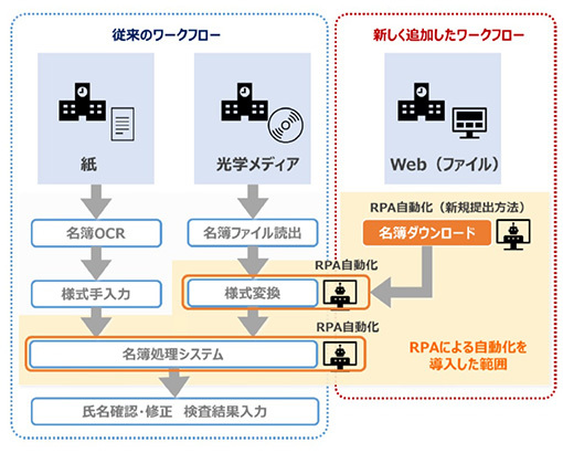 その際には、新たな業務となる受診者名簿を取得するウェブサイトの入力フォームの設計を支援するとともに、これまでと同様の光学メディアや紙などの提出でも、RPAで自動化する部分と人手で作業する部分の切り分けを行い、名簿取得や様式変換、印刷業務などのRPAで自動化する部分については日立システムズが設計し、RPAの導入までを行った。