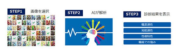 質問に対して回答を選択する従来型の適性検査は、質問数が非常に多く時間がかかるとともに、結果を良く見せようとするバイアスがかかることで精度が下がるという問題があった。これに対してカラタレは、シリコンバレーのスタートアップ企業であるdotinが開発した、色彩心理学を活用したAI技術によって、画像を選ぶだけの簡単な操作でバイアスフリーの特性分析を実現している。
