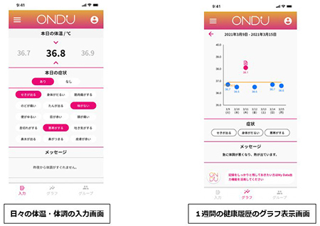 OND'Uは、日々の検温や体調の記録が簡単にできるとともに、グループ内でのコミュニケーションを取ることができるアプリ。今回、社内での実証実験を実施し、一定の効果が認められたことからトライアル版として無償提供を開始する。企業の職場をはじめ教育現場(保育、学校、学童、部活、塾など)や高齢者施設など集団生活が必須の現場や、マラソン大会やスポーツ大会、その他イベント、飲食業、観光業、警備業、接客業など、さまざまなシーンで利用できる。