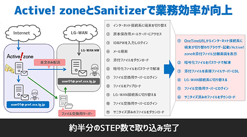 Active!zoneとSanitizerが連携することで、従来の添付ファイル取り込み手順を大幅に削減し、メール業務での自治体職員の業務効率を改善することが可能となる。
