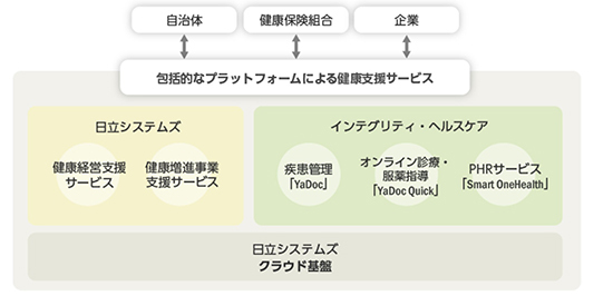 今後は、日立システムズの強みであるセキュアなクラウド基盤上での医療情報システムに関する知見・ノウハウと、インテグリティ・ヘルスケアの強みであるオンライン診療や服薬指導、PHRサービスを連携させることで、医療情報・データを一元的に管理し、それらの情報に基づいた総合的な健康支援サービスの提供を目指す。例えば、THLと連携した日立システムズの健康経営支援サービス、健康増進事業支援サービスとインテグリティ・ヘルスケアのSmart One Healthを日立システムズのクラウド基盤で連携することで、予防から治療までのサービスを企業に提供することが可能となる。