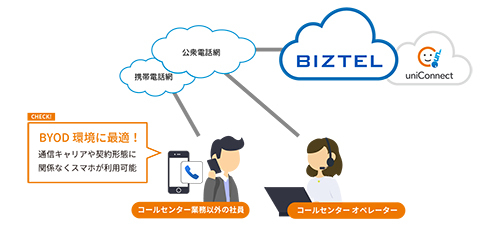 これにより、BIZTELを利用する顧客は、契約している通信キャリアや契約形態(個人契約/法人契約)に関係なく、スマートフォンをBIZTELの内線/外線端末として利用できるようになる。