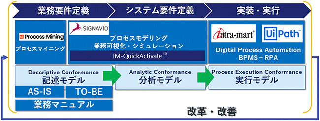 IM-Signは、従来からプロダクト連携しているAdobe Signとクラウドサインと簡単に機能連携できるモジュール。具体的には、intra-martのローコード開発ツールの一つで業務ロジックをノンコーディングで作成できるIM-LogicDesignerを通じて、それぞれのAPIを呼び出すことで各サービスがもつ全ての機能をintra-mart上で利用することができる。