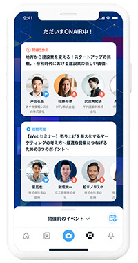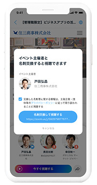 イベントに参加する際にはオンライン名刺機能を利用して主催者と名刺交換することにより、フォームへ情報を入力することなくイベントに参加できるようになる。開催予定のイベントは開催10分前に通知するよう設定することが可能で、ユーザーが忘れずにイベントに参加できるようにしている。リアルタイムで開催中のイベントには事前に申し込むことなくすぐに参加することもできる。