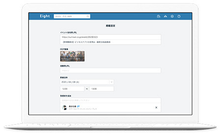 イベントの主催者は、開催するイベントの告知ページと視聴用ページのURL、開催日時を入力するだけでイベントを登録することができる。Eightのオンライン名刺を用いて申し込みを受け付けるため、参加者の手入力と比べて正確な情報を収集することができるという。