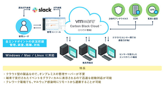 導入にあたっては、具体的な監視対象として、大学の事務業務で利用されるPC約160台を選定した。今回のような取り組みでは、複数のセキュリティ製品同士が競合してうまく動作しないことも多くあるが、VMware Carbon Black Cloudはスムーズに既存の環境に導入することができた。また、端末へのエージェント配布は、資産管理ソフトを利用して20~30分程度で完了した。