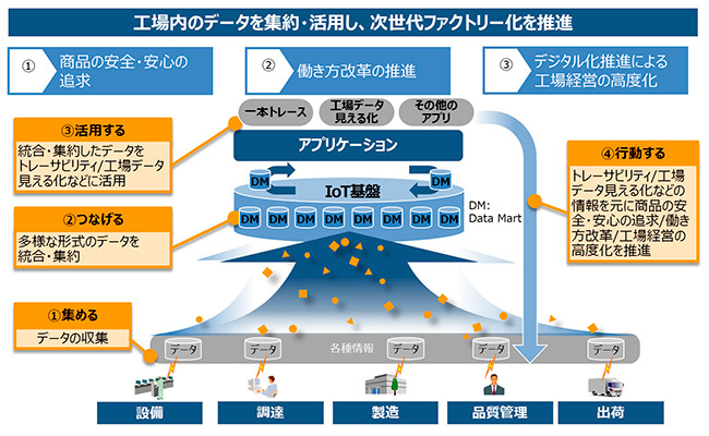 新工場では、高頻度で発生する生産データを「Hitachi Digital Supply Chain/IoT」を用いて高速かつ安定的に収集・伝送し、それらのデータをデータ統合・分析基盤「Hitachi IoT-Platform for industry」で統合。生産現場視点でのデータ分析や最適化に必要なデータの抽出・紐づけとアプリでの利用を容易にした。従来は工程・ライン単位でデータを集約・利活用する個別最適にとどまっていたが、IoT基盤の活用によって工場全体の最適化が可能となり、工場経営を高度化するという。