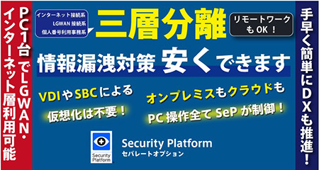 SePセパレートオプションは、三層分離に対応し情報漏えいやサイバー攻撃の危険性を排除するとともに、リモートワークやテレワークまで1台のPCで、低コストで実現するソフトウェア。三層に定義されているLGWAN環境での業務やインターネット環境での業務ごとに、「ファイルやデータの保存場所」「使用アプリケーション」「クリップボード」などに関する設定を個別に行うことができる。