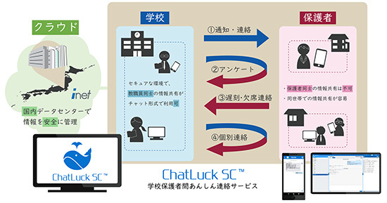 ChatLuck SCは、パソコン、タブレット端末、スマートフォンを活用し、学校から保護者に向けリアルタイムの通知・連絡、アンケートの実施・回収、また保護者から学校に向けて遅刻・欠席連絡などを迅速に行えるコミュニケーションツール。コロナ禍でさらにニーズが高まる「学校からの迅速な情報発信」や「学校と保護者間での緊密なコミュニケーション」の実現、教育現場でのDX化促進を支援する。