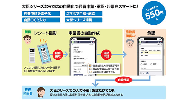 大臣スマート経費精算サービスは、スマホでの経費申請・承認や大臣シリーズでの自動仕訳を可能にする新サービス。大臣シリーズならではの自動化で、経費申請・承認・起票をスマートに行うことができる。