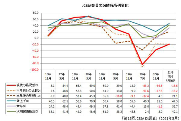 唯一前回比でマイナスだったのが、「半年前との景況感比較DI」。前回比0.4ポイント減の-18.2と、わずかながらマイナス幅が拡大した。前回調査の11月は感染症拡大の第3波直前だっただけに、その後2度の緊急事態宣言が発出されるなどした影響が出ているようだ。一方、国内外の感染症の状況は徐々に終息の方向に向かいつつあり、他のDIは大幅に回復したものとみられる。