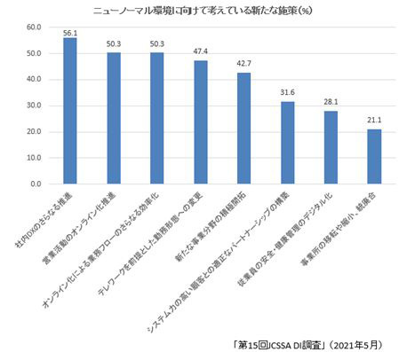 新たな施策では、「社内DXのさらなる推進」が56.1%で最多。以下、順に「営業活動のオンライン化推進」が50.3%、「オンライン化による業務フローのさらなる効率化」が50.3%、「テレワークを前提とした勤務形態への変更」が47.4%と続く。また、「従業員の安全・健康管理のデジタル化」も28.1%と3割弱あり、いずれもシステム化推進を軸に課題を乗り越えようとしている姿が浮き彫りになった。