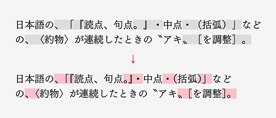 FONTPLUSでは今回、この課題を解決するためにOpenType機能の「chws(Contextual Half-width Spacing)」と「vchw(Vertical Contextual Half-width Spacing)」を組み込んだウェブフォントを開発した。chws/vchwは、それぞれ横書きと縦書きのテキストで、日本語の約物が特定の組み合わせで連続した場合のアキを調整する機能となる。