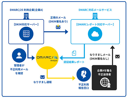 攻撃者が、DMARC/25 Analyzeを導入している企業のドメインをなりすましてメールを送信すると、送信ドメイン認証(SPF、DKIM)に失敗したメール(なりすましメール)として情報が記載されたDMARCレポートを解析し、不正利用が疑われるIPアドレスの不正利用報告窓口にDMARC/25 Analyzeからメールで通報する。