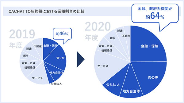 外部からのリモートアクセスや業務データの取り扱いに対する制約が厳しいこれらの業界へのサービス導入が加速している背景には、CACHATTOが備えているセキュリティ機能があると考えられる。また、全体に占める割合は高くないものの、前年比で見ると約2倍にシェアが伸びている「公益法人」も、契約金額では前年比で約7.5倍と急伸しており、この1年間でテレワークの導入が加速したことがうかがえるとした。