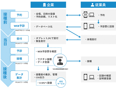 ヘルス×ライフ職域接種機能は、新型コロナウイルスワクチンの職域接種で必要な予約管理・ウェブ予診・会場受付や同社提携医療機関の紹介、接種後のデータ管理からV-SYS登録までワンストップでサポートする機能。従業員は、PCやスマートフォンアプリ上で予約・予診・接種登録することができる。