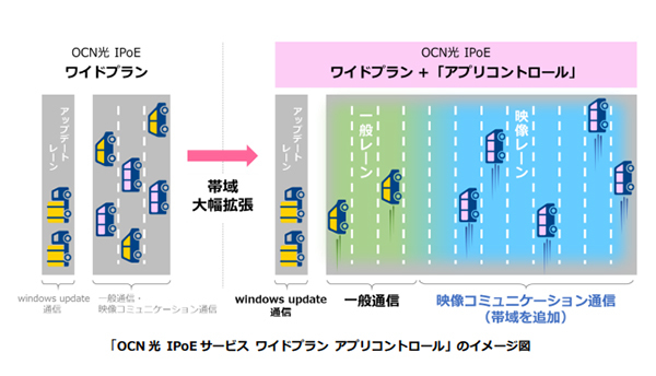NTT Comでは、法人向けインターネット接続サービス「OCN光 IPoE サービス ワイドプラン」(ワイドプラン)を従来のPPPoEサービスやIPoEサービス標準プランに比べて大容量化した通信設備で提供してきた。新オプションでは、オンライン会議3サービス(Microsoft Teams、Cisco Webex、Zoom)の通信用として帯域を追加し、利用できる帯域幅を既存のワイドプランに比べて約4倍に拡張するとともに、その他の通信と区別して処理する。
