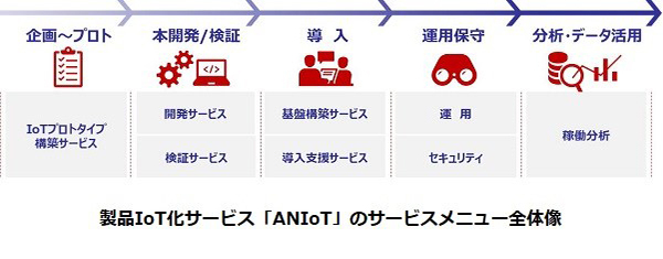ANIoTは、コンシューマー向け家電製品から産業用プロダクトに至るまで、「製品IoT化をもっと簡単に」を掲げ、顧客価値向上や保守費用低減につなげるサービス。製品のIoT化構想に関する企画段階から試作、製品評価・テストまでを支援する。第1弾サービスとして、顧客のPoC(Proof of Concept)ニーズに合わせ、IoTゲートウェイ、クラウド環境、ウェブ・スマートフォン(スマホ)アプリをパッケージ化した「IoTプロトタイプ構築サービス」を先行提供する。