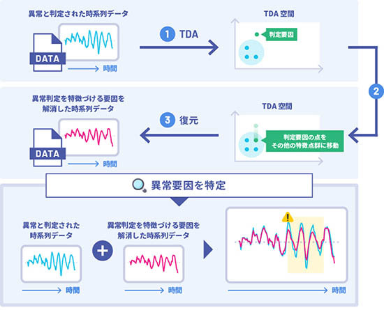 具体的には、富士通が開発した時系列データを特徴ごとに分類して異常検知する解析技術を用いてAIで異常と判定されたデータから異常判定の要因となった特徴とそうでない特徴を平面(TDA空間)上にマッピングする。その平面上で、要因となった特徴の点データを要因でない特徴の点データ群に近づける変換を行う。