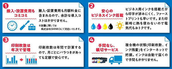 今回のフラット12は、保守サービスなどを専門に行うSHINKOを通じて、卓上に設置できるコンパクトなプリンタの利用と、設置や修理などのきめ細やかなサポートが月額料金に含まれた定額プリントサービス。サポートの手厚さや定額の利便性を望む顧客に向けた選択肢の一つとして、サブスクリプション型のサービスを強化する。