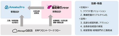 企業におけるDX環境の構築と経営環境を支える管理会計の実現が容易ではない状況の中、OBCの財務会計システム勘定奉行クラウド」とKCCSの管理会計クラウド「Amoeba Pro」、ITCSのERPフロントシステム「Manage OZO3」をクラウド上で連携。これによって、SMBのDX化と経営課題解決を同時に支援する。