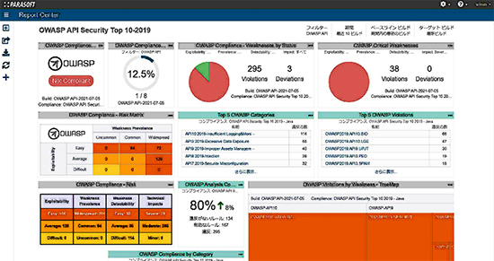 Jtestの解析結果を集計・分析するParasoft DTPを利用することで、OWASP Top 10 2017やCWE 4.4、CWE Top 25 2020に則った遵守サマリーレポートや逸脱のレポートをいつでも確認できるようになる。ガイドラインの遵守状況をタイムリーにレポートし、ソフトウェアの欠陥に起因するビジネスリスクの回避を支援する。