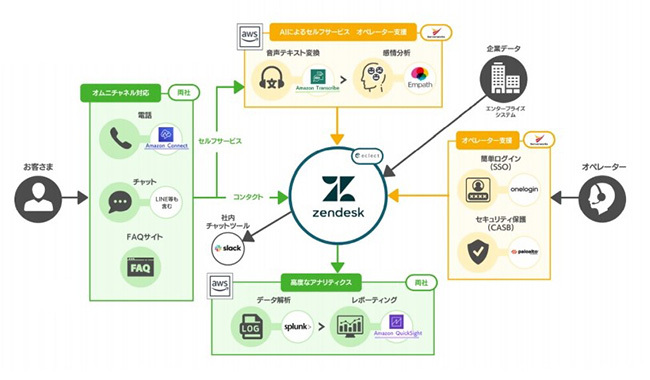 協業によって、両社はそれぞれの強みを生かしたインテグレーション(複合的サービス)を模索。Amazon Connectのオペレーターが利用する「Contact Control Panel(CCP)ソフトフォン」を共同で開発するほか、Amazon Connectの音声データをAmazon Transcribeによる通話内容のテキスト化(Speech to Text)の実行やZendesk へのチケット自動登録機能の提供を目指す。