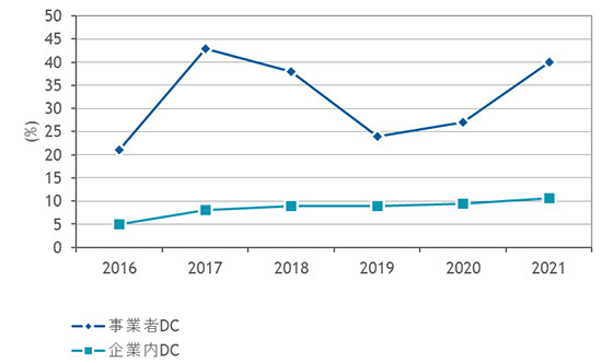 調査によると、事業者DCでは40%の管理者がデータセンターやサーバールームの新設予定があると回答したのに対し、企業内DCの管理者のうちDCやサーバールームの新設予定があると回答したのが11%にとどまった。多くの企業のIT資産がクラウドサービス上で稼働するようになっているため、企業内DCを新設する傾向は弱い一方で、クラウドサービス提供に必要な事業者DCが次々と新設している。