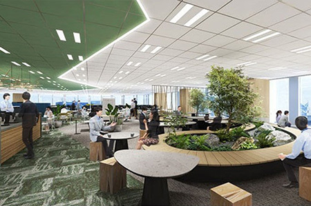 執務エリアは、グループ各社の営業・SE・開発・スタッフなど、さまざまな職種の社員が共同利用する空間とする。フリーアドレス化に加え、オープンミーティングスペース、ミーティングブース、カジュアルソファーなどを設け、コミュニケーションやグループワークの活性化を図る。