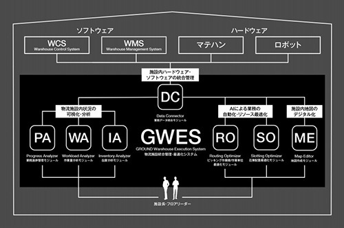GWESは、ミドルウェアとなる共通データ基盤、AIを適用した各種機能モジュール群から構成され、メーカーを問わず、さまざまなハードウェア(マテハンやロボット)やソフトウェア(Warehouse Management SystemやWarehouse Control System)とシームレスに連携することでデジタル化を推進し、物流施設全体の最適化や可視化を実現する汎用性・拡張性の高いパッケージシステム。