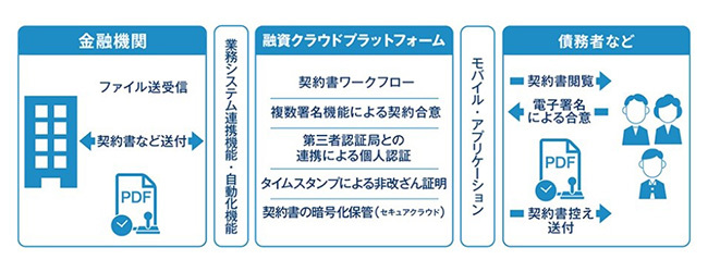 融資クラウドプラットフォームは、金融機関の個人・法人向け融資手続きを受付から契約まで電子化・自動化するサービス。標準化されたサービス機能を利用することで短期間での立ち上げが可能になる。