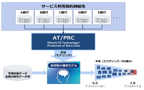 トランザクション・レンディング向けAI審査サービスは、複数行のデータを用いたコンソーシアム型(集団参加型)のAI審査モデルを活用し、推計したデフォルト確率を利用行に提供するサービス。各利用行のトランザクション・レンディングの融資残高に応じて月額利用料が定められるため、利用量に応じたリーズナブルな利用料金で、AI審査サービスを利用することができる。