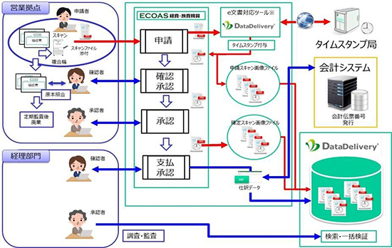 具体的には、ECOAS経費・旅費精算への書類の入力からDataDeliveryへのデータ保存まで一貫して電帳法の「真実性の確保」要件を満たしたデータの流れを実現。また、スキャナ保存された国税関係書類と、会計システムで管理される国税関係帳簿の関連性も確認できるため、「可視性の確保」要件も満たしている。