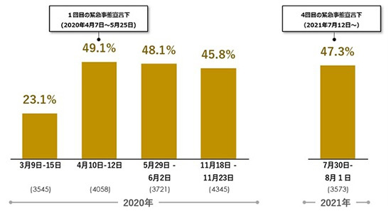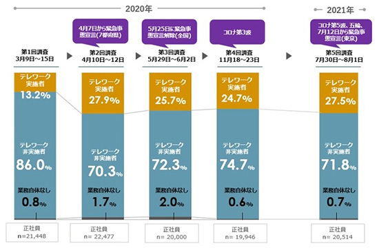 4度目の緊急事態宣言の対象となった東京都に限ってみると、正社員のテレワーク実施率は47.3%。20年4月比で1.8ポイント減、20年11月比で1.5ポイントの微増にとどまった。