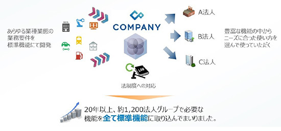 そこで、人事給与管理システム「COMPANY 人事・給与」、ワークフローシステム「COMPANY Web Service」、勤怠管理システム「COMPANY 就労・プロジェクト管理」の導入を決定。これまでカスタマイズを重ねてきた現行システムの業務領域をカバーできるCOMPANYの標準機能の網羅性や汎用性を高く評価した。