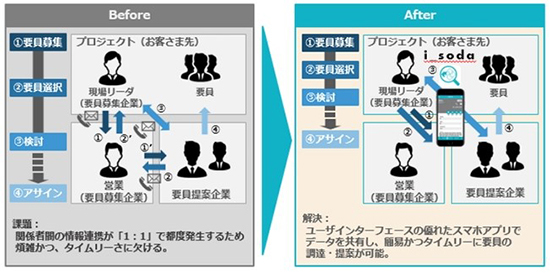 i_sodaは、システム開発の要員募集をしている企業(要員募集企業)が案件を登録することで、技術要員を提供している企業(要員提案企業)と簡単にマッチングできる。要員提案企業が要員情報を登録することで、自動的に掲載されている要員募集情報とマッチングが行われるため、要員提案業務の効率化を実現する。