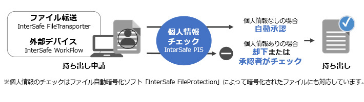 今回のバージョンアップでは、ネットワーク間の安全なファイル受け渡し時の運用効率化と個人情報管理強化を実現した。主な新機能として、ファイル転送や外部デバイスでファイルの持ち出しを申請する際に対象ファイル内の個人情報やマイナンバー情報の有無を自動でチェックする。ファイルに個人情報やマイナンバー情報が含まれていない場合は自動で承認され、含まれていた場合には申請を自動で却下もしくは承認者によるチェックを行う。