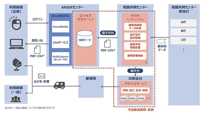 電子帳票照会サービスは、利用行が電子帳票を顧客企業にインターネットバンキング経由で交付でき、印刷代や郵便費など紙帳票作成にかかる経費を削減できる。一方、共同差出サービスは利用行が紙で交付を続ける帳票を全利用行分まとめて印刷・封入・郵送、紙で残る帳票の経費を削減する。紙資源の使用をできるだけ抑制し、環境に配慮した取り組みとして利用行のSDGsの達成にもつながる。