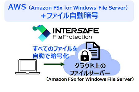 セキュアクラウドファイルサーバーは、AWSの「Amazon FSx for Windows File Server(FSx)」とALSIの高速ファイル自動暗号化ソフト「InterSafe FileProtection」を組み合わせたソリューション。