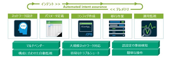 具体的には、検証された再現性のある設計に加えて、予測分析や逸脱の事前警告を行うことで、ネットワークの構築と運用を自動化する。クラウド環境に対応しているため、柔軟に利用することができる。